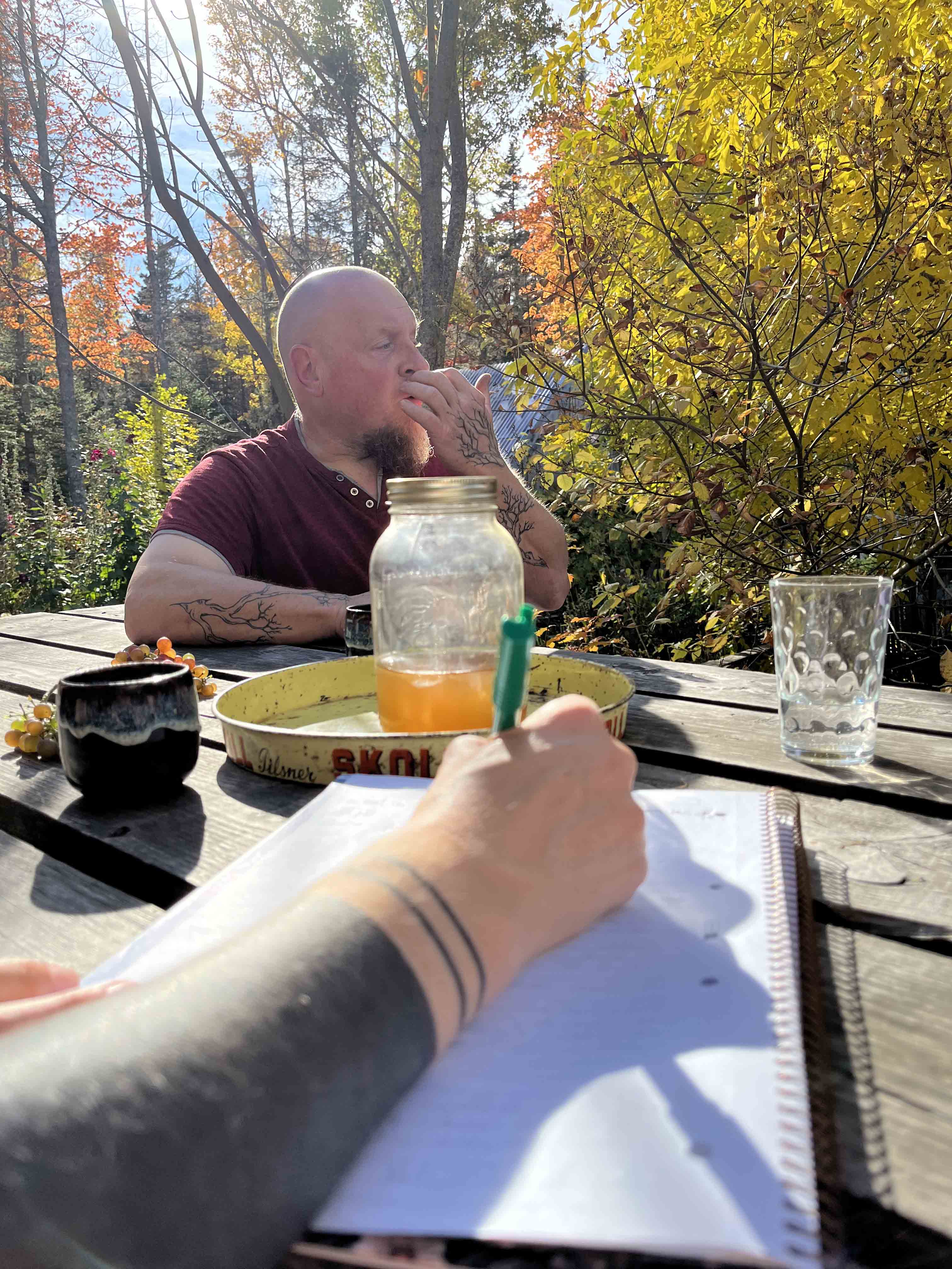 Catherine et Gérard vivent au Québec depuis 20 ans. 15 ans ici, dans cette forêt à Douglastown. En 1989, ils ont entrepris un roadtrip de 3 mois. Ils ont aimé ici. Ils sont revenus 6 ans plus tard. « On s’est barré. » Je souris aujourd’hui, parce que l’autre jour, alors que nous faisions un Espace game (parce que les enfants sont des enfants et que s’ils ne râlent même pas quand nous marchons, il y a un moment où faire un Escape game ou aller à la piscine est indispensable), Loïc qui nous a accueilli chez SOS Aventure à Québec, qui portait une longue robe noire et des talons dans un style semi-baroque, semi-gothique, nous a dit de « barrer » notre casier. Il m’a fallu un peu de temps pour comprendre qu’il parlait du cadenas. Je me demande maintenant ce que pourrait signifier le fait que Catherine, Gérard et leurs trois fils se soient barrés de Belgique…
