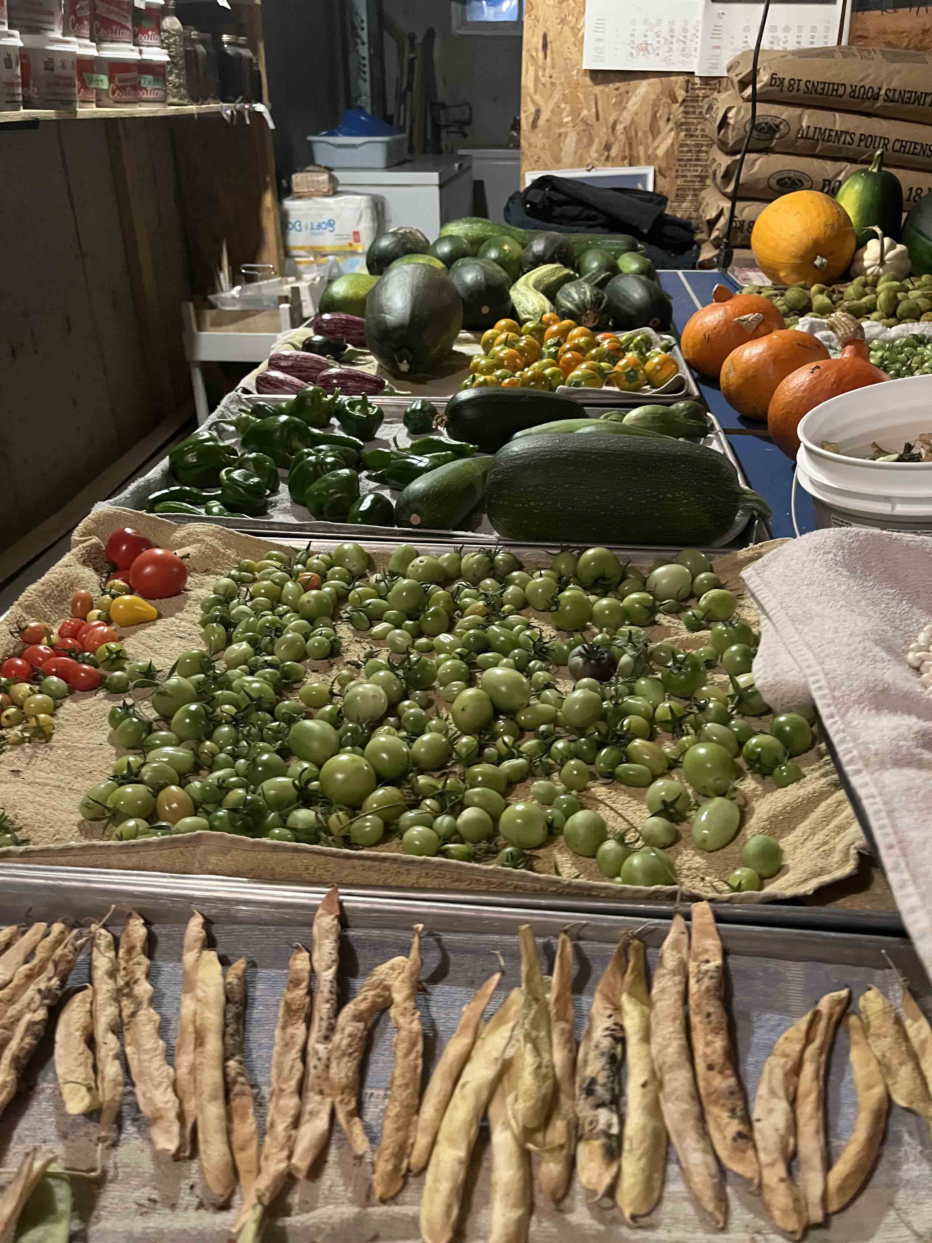 Vous n’avez jamais imaginé venir en France plutôt qu’au Canada lorsque vous avez décidé de quitter la Belgique ? « En France, là où il y a 59 centrales nucléaires ? Ça serait souhaitable vous trouvez ? » Nous parlons de l’avenir, des guerres à nos portes et des vies que l’on se souhaite. Gérard a ces phrases frappées au coin du bon sens, ces questions qu’il vous retourne et ces réponses qui en sont vraiment. Rien n’est donné en exemple, encore moins en leçon. L’assurance solide semble vivre collée à un doute souple. Encore une fois, une attention vivante, fine, qui questionne, interroge, cherche la façon de faire la plus juste pour rester cohérent, pour conserver le plaisir de vivre libre. Je pense à ces environnements qui semblent rendre féconds. Une forêt, un potager, des livres, des questions, des discussions, des gestes qui tentent, qui s’ajustent, des animaux et des plantes. Le savoir détenu par Catherine et Gérard me semble monumental. Je ne suis pas certaine qu’ils aimeraient l’idée. Peut-être me diraient-ils que le savoir ne veut rien dire, que l’expérience est une source mais que tout est à faire, à poursuivre, à refaire, encore et encore, au rythme des saisons, des récoltes et des désirs. L’abondance autour de nous va avec la sobriété de Catherine et Gérard. Pas de grands maux, pas d’effusion, pas de déclaration. Des voix tranquilles qui nous racontent et nous montrent. Nous sommes touchés de la générosité qu’ils nous offrent, en nous accordant leur temps et leur récit, alors qu’il y a tant à faire, dans chaque recoin de leur territoire.