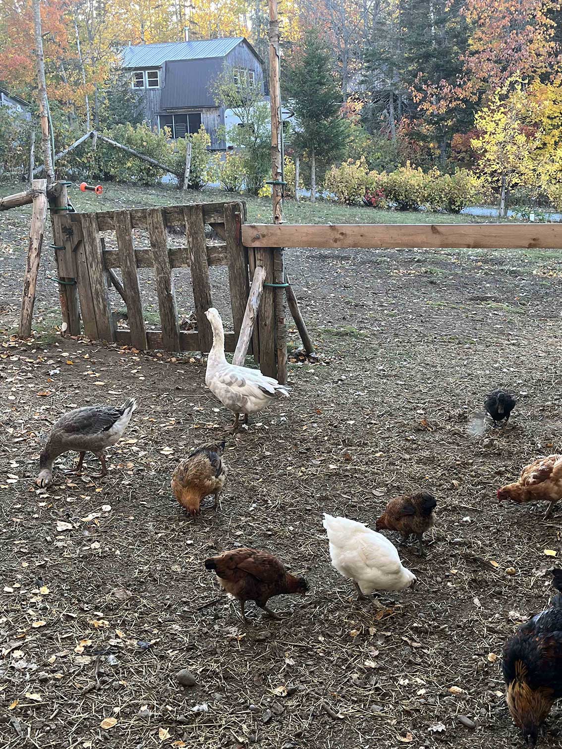 Deux jours après notre visite, nous échangerons quelques nouvelles : « Vu la météo, nous avons plutôt été chercher de la nourriture pour les cochons puis nous avons passé le reste de la journée en forêt sous la pluie, à brûler des tas de branches issus du débardage de cet été. Aujourd’hui, on prépare le gîte et la micro-maison. Ensuite on récolte dans le potager (tomates, cerises de terre, patates,…) La cueillette des champis se fera en début de semaine prochaine, après l’abattage des volailles de cette fin de semaine. » Je repense à « Une année à la campagne », de Sue Hubbel, mon livre préféré. Et puis : « Voilà, les volailles, c’est fait : cinq oies, une vingtaine de canards, une quarantaine de poulets. Demain, on débite, on fait les conserves etc… » Nous, demain, que ferons-nous pour nous sentir à notre juste place ? Je me dis qu’est peut-être ici la question que soulève notre rencontre avec Catherine et Gérard.