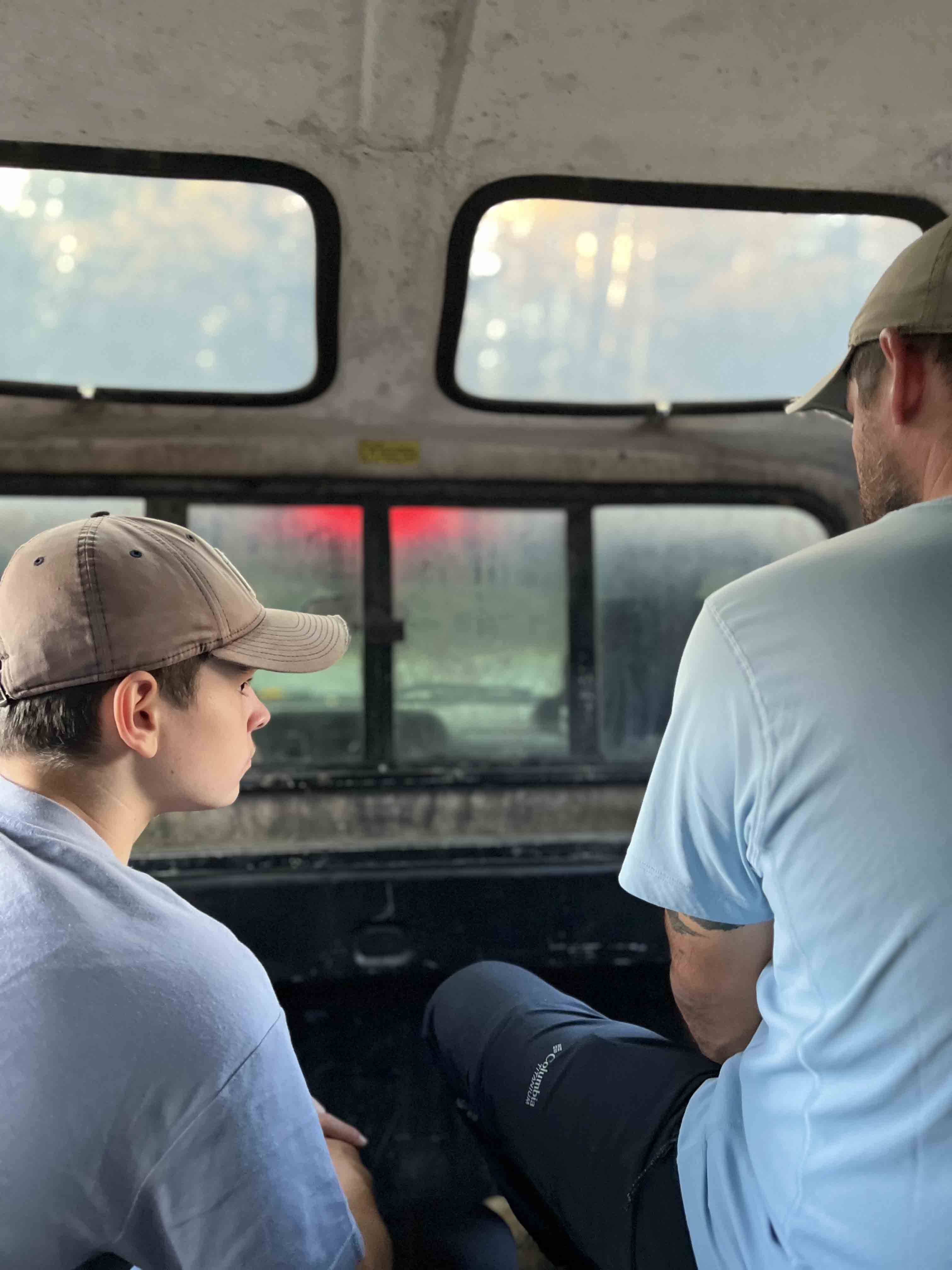 Nous continuons d’échanger tout en visitant les lieux. Le potager – nous goûtons de délicieuses cerises de terre. Nous rencontrons les animaux – cochons, lapins, volailles, vaches, taureau… Nous découvrons le garde-manger, les dizaines et dizaines et dizaines de bocaux remplis de légumes, viandes, plats cuisinés. La famille consomme ce qu’elle a semé, récolté, cuisiné, ce qu’elle a entretenu, ce dont elle a pris soin. Nous goûtons un morceau de leur charcuterie et après nos repas sommaires dans le camping-car, elle a le goût du paradis. Nous grimpons dans le coffre du pick-up pour aller voir le chantier de la maison en cours. J’entends des noms de végétaux que je n’ai jamais entendus de ma vie. Le chantier en cours me rappelle celui de notre maison. Du bois, des vis, les mêmes questions, les mêmes attentions. Ici, ça va loin puisque le bois utilisé pour construire la maison vient des arbres d’à côté, choisis, débités, passés dans une scierie mobile. Je vois que Xavier a les yeux qui brillent.