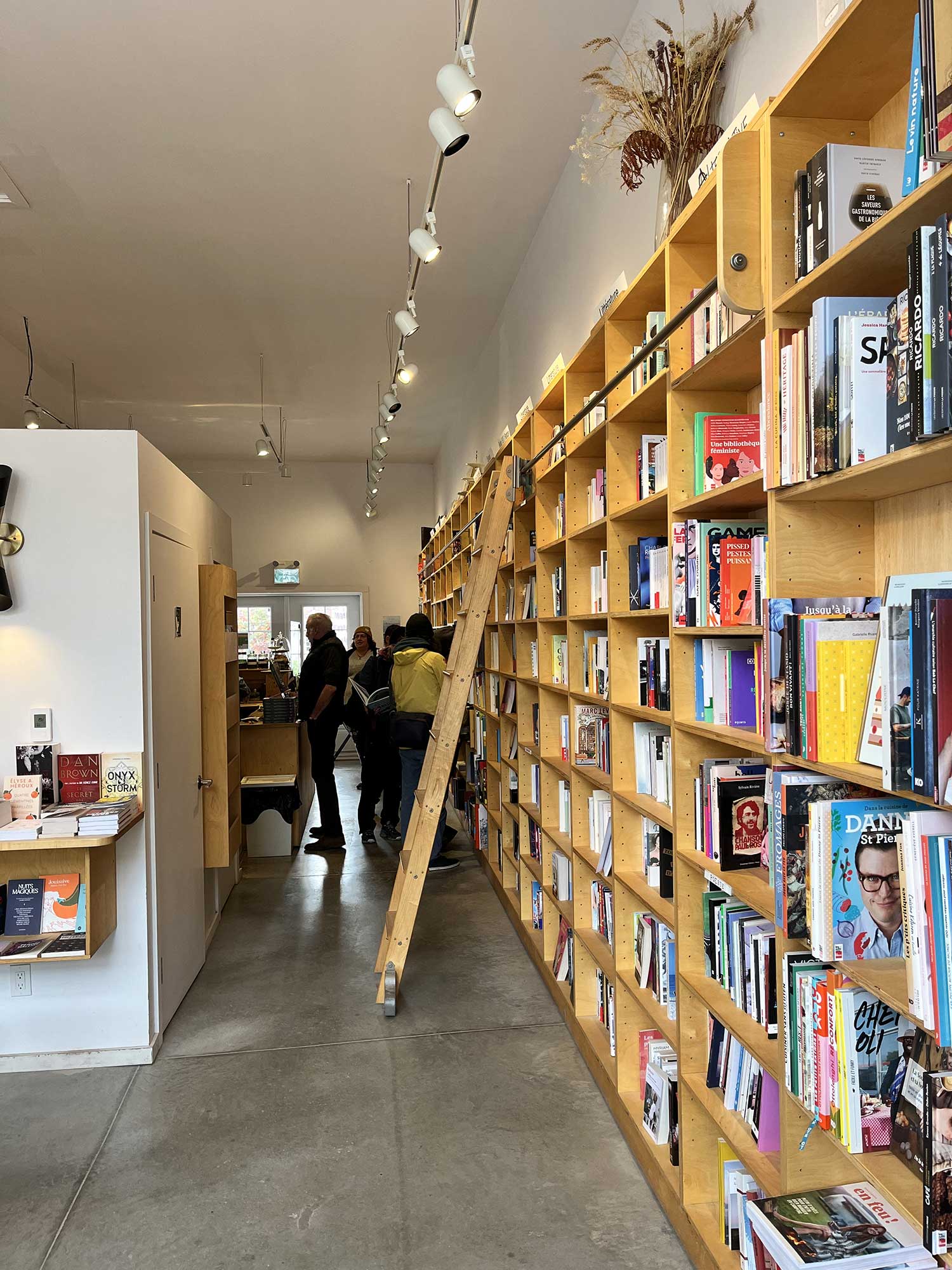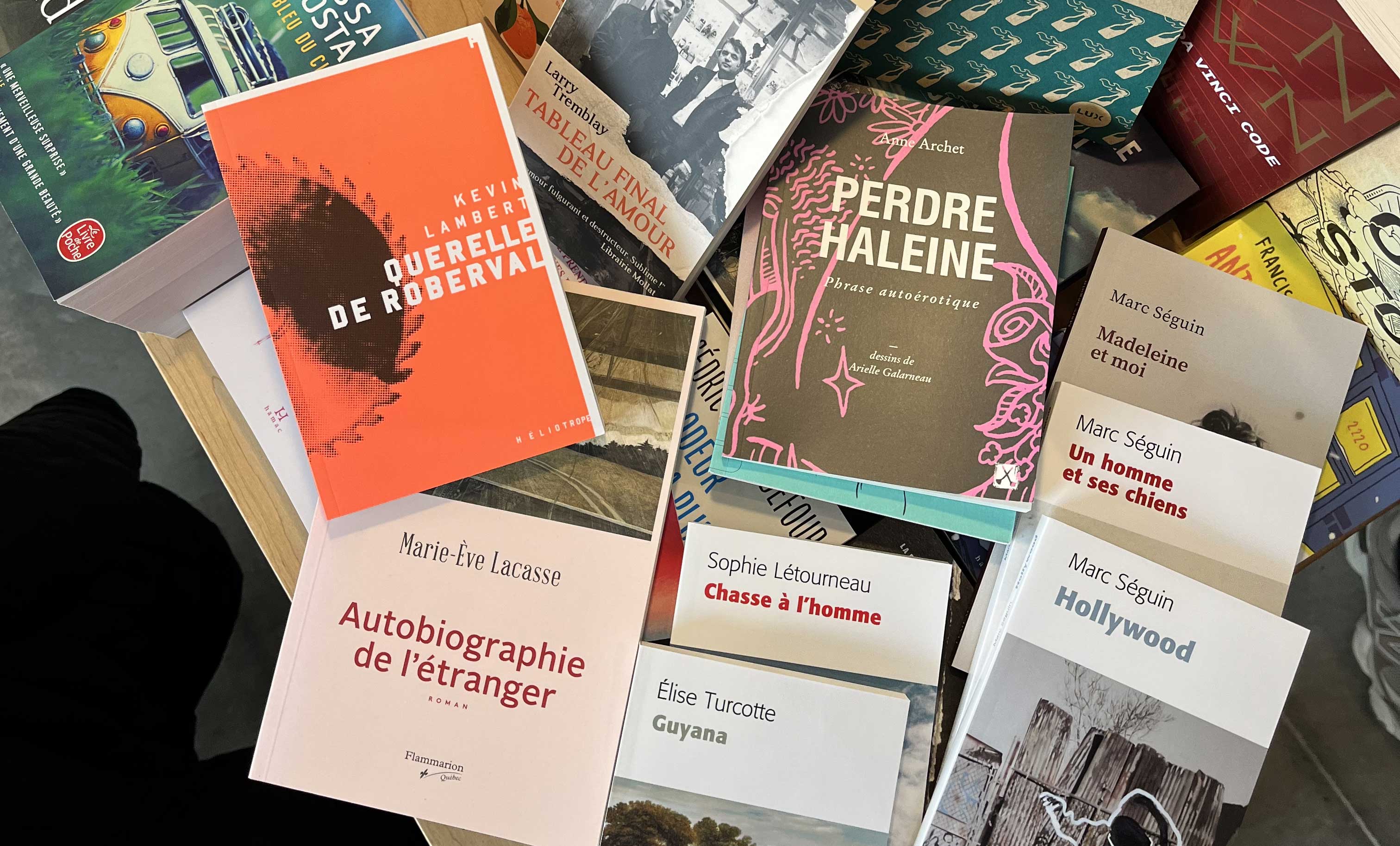 Dans les rayons, je trouve les livres de mon amie Julia Kerninon. Je réalise que je n’y connais vraiment rien en littérature québécoise. Je demande conseil à Patrice. Je sens comme il a à cœur de bien me répondre, de me répondre de la façon la plus complète possible, ou la plus sincère. Il cherche parmi les livres qu’il a en stock, abandonne les références qu’il n’a pas mais me donne quand même les noms et les titres. Il commente chacune de ses propositions. Privilégie les formats de poche parce qu’un jour, nous aurons à reprendre l’avion avec des valises déjà lourdes et déjà pleines. J’ai bientôt les bras remplis de livres. Xavier, Robin et Montaine ont fait leurs choix depuis longtemps. Ils m’attendent mais je sais aussi qu’ils veulent me laisser toute à ma joie d’être dans ce lieu où l’on mange bien, où il y a des livres et un vrai parti-pris de libraire, loin des grandes enseignes où tout se trouve mais où tout se perd aussi. Ici, il y a un libraire adorable, puits de références et de conseils.
