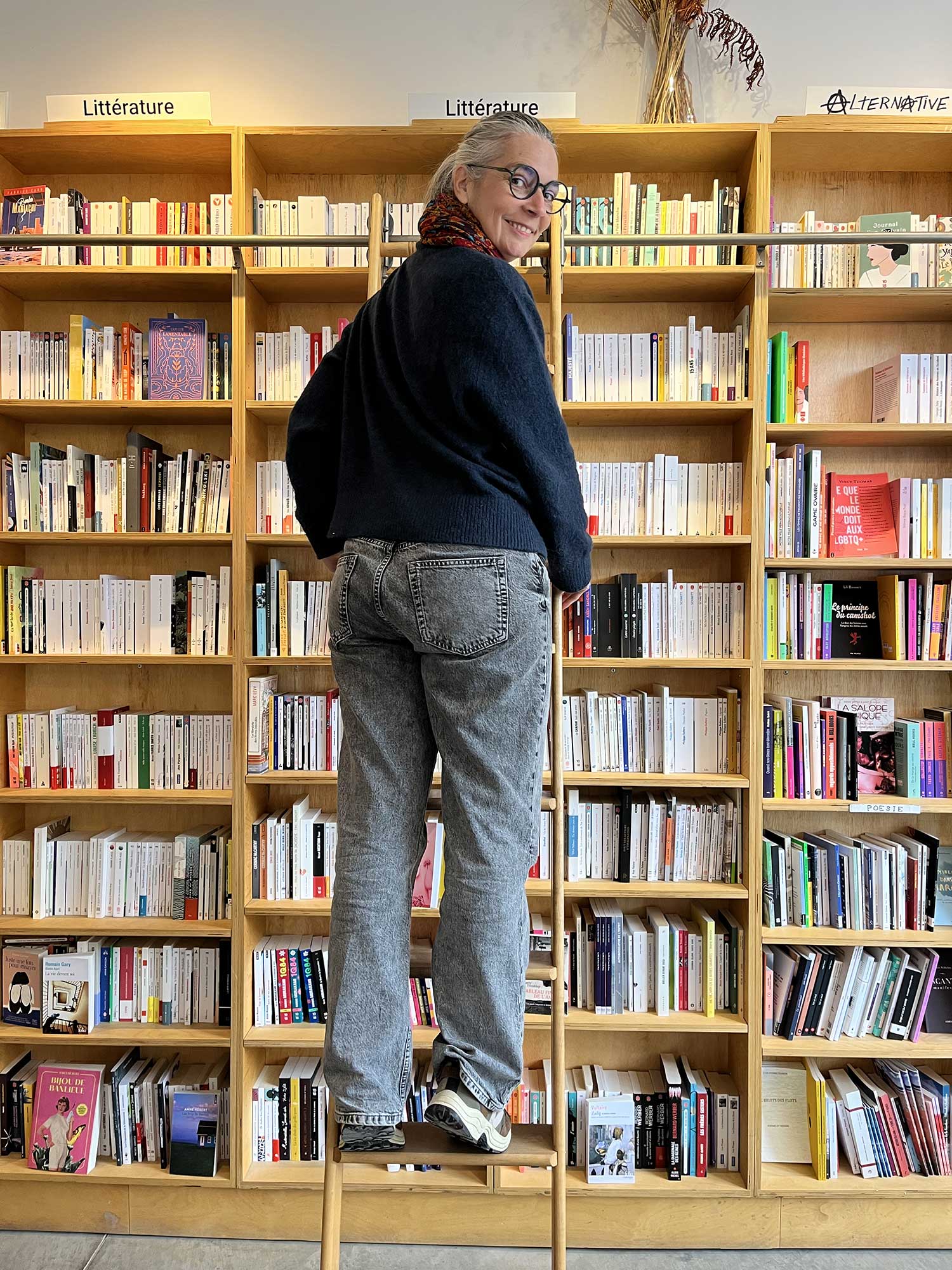 Il faut imaginer : le grand vent dehors, les toutes petites tables, la vaisselle fleurie, un pain au chocolat très fourni en chocolat, un brownie au poids équivalent au bon goût, et des chocolats chauds qui fument, des livres jusqu’au plafond. Et. Et : une échelle de bibliothèque. « C’est notre marque de fabrique ! Tout le monde nous dit qu’elle rappelle celle d’Harry Potter. » Je me mets à penser à Olivander’s, le magasin de baguettes magiques. Puis je dois revenir au monde réel.