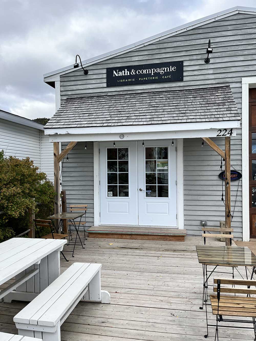 Je suis toute à cette histoire lorsque nous nous rendons jusque chez « Nath et compagnie ». Je ne connais pas Nathalie mais j’ai repéré sa librairie-salon de thé dans la revue des libraires indépendants du Québec que j’avais trouvée à la bibliothèque de Montmagny où nous avions passé une journée de travail. La veille, pas de chance, c’était jour de fermeture. Mais aujourd’hui, c’est bon. L’épisode du portefeuille perdu est finalement un cadeau caché : nous allons pouvoir aller à la librairie. Une librairie-salon de thé où il se pourrait bien qu’un jour, une nana qui bosse chez un gros promoteur immobilier à New-York se retrouve par mégarde au moment des fêtes de Noël et tombe amoureuse d’un gars en chemise à carreaux qui roule en pick-up et fait du sirop d’érable le week-end, avec son fils orphelin. Quelque chose comme ça. Une librairie avec du bois, des pâtisseries alléchantes et évidemment, plein plein de livres.